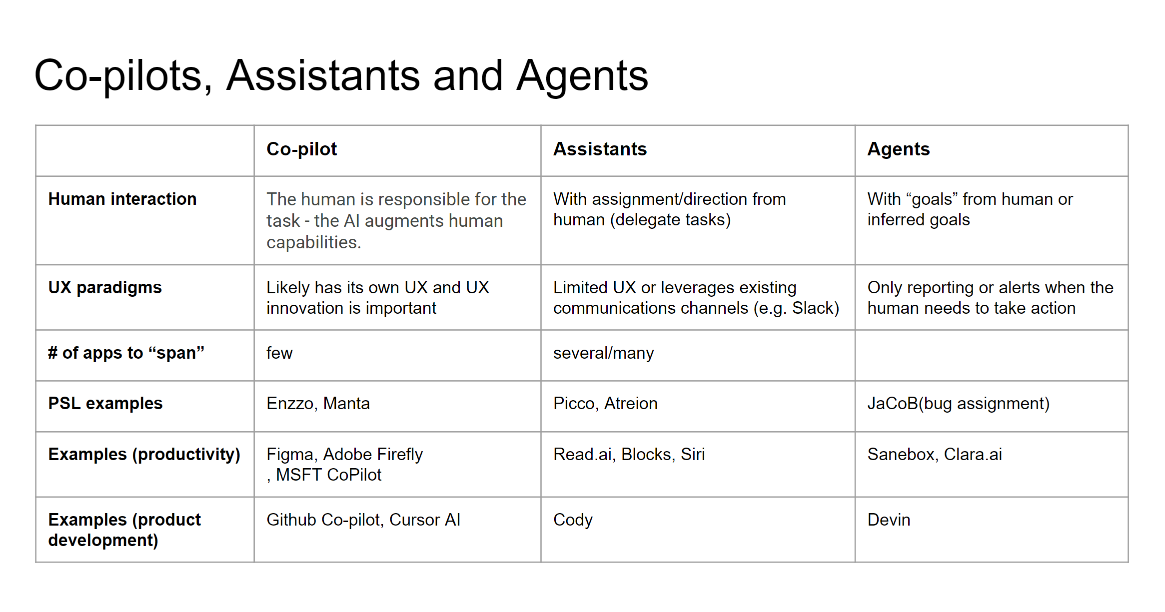 In this post, I’ll break down the three primary roles of AI—co-pilots, assistants, and agents—explaining their unique functions and offering insights into how they can be leveraged effectively in various contexts. It’s early in this cycle, and our thinking at Pioneer Square Labs is evolving quickly, but I think it’s important to have a perspective and gather input to keep refining my thinking.